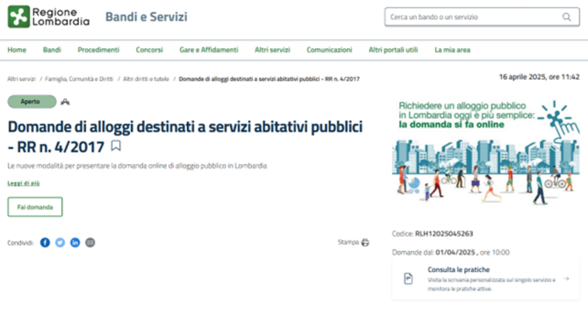 La domanda va compilata dal richiedente esclusivamente in modalità telematica accedendo alla piattaforma informatica di Regione Lombardia https://www.bandi.regione.lombardia.it/servizi/servizio/altri-servizi/dettaglio/comunita-diritti/altri-diritti-tutele/domande-alloggi-destinati-servizi-abitativi-pubblici-rr-n-4-2017-RLH12025045263